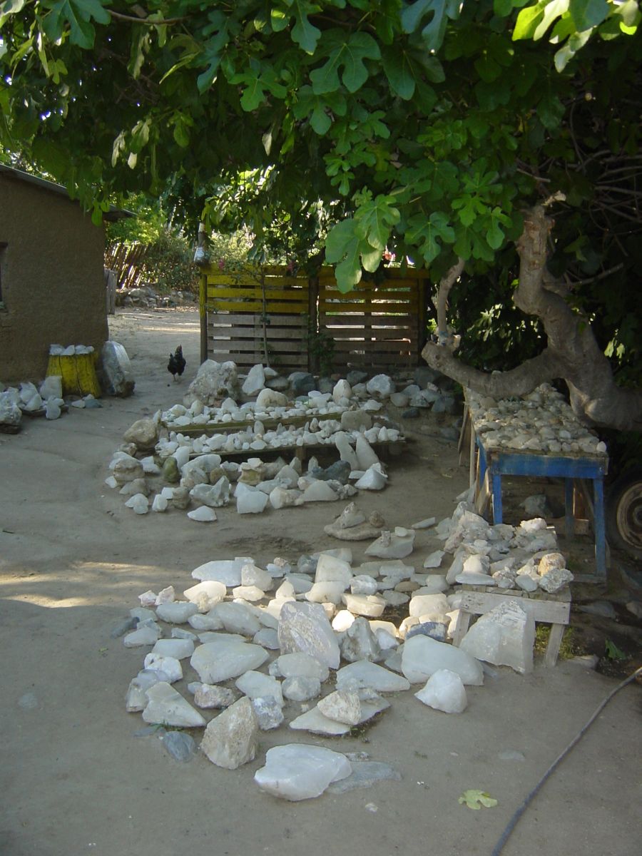 Attracted by some nice images of Quartz crystals in a tourist guide, we started an exploration tour from Santiago north to the small village of Tilama in the Coquimbo region in Chile. Tilama is dominated by a quite big quartz mine. The vein is getting excavated in a vertical open pit mine. Cavities inside the vein contained sometimes huge quartz crystals up to more than one meter. Unfortunately most of the crystals have a very bad quality. Only some smaller specimens up to 20cm have a perfect quality. Very interesting are the inclusions of Molybdenite crystals in the quartz. They occur as small metallic reflective crystals up to 1-2 mm. Some of them are orientated as phantoms. The metallic reflections are leading into a wonderful visual effect. The owner of the mine sells pieces. The whole garden is covered with quartz crystals.